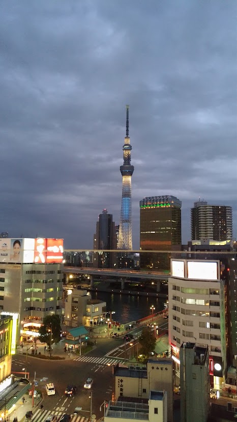 | 另一個角度可看到晴空塔及朝日啤酒大樓那知名的金大便。 |